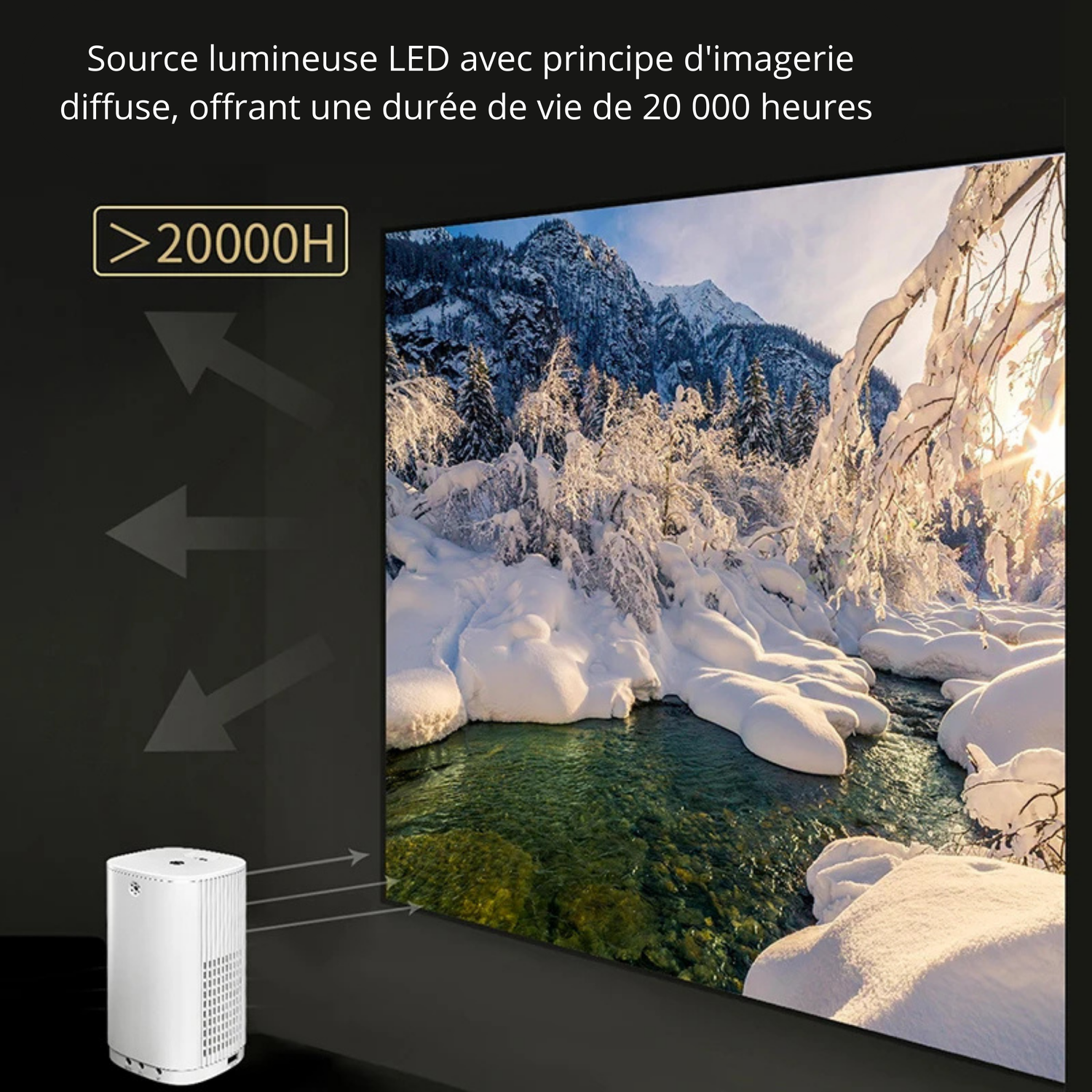 Ce mini projecteur portable offre une luminosité de 4000 lumens et un contraste de 2000:1, garantissant des images nettes et dynamiques. Sa technologie LED longue durée assure une utilisation prolongée jusqu'à 20 000 heures.