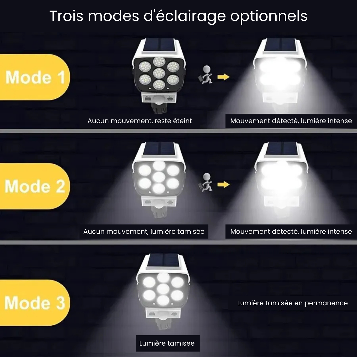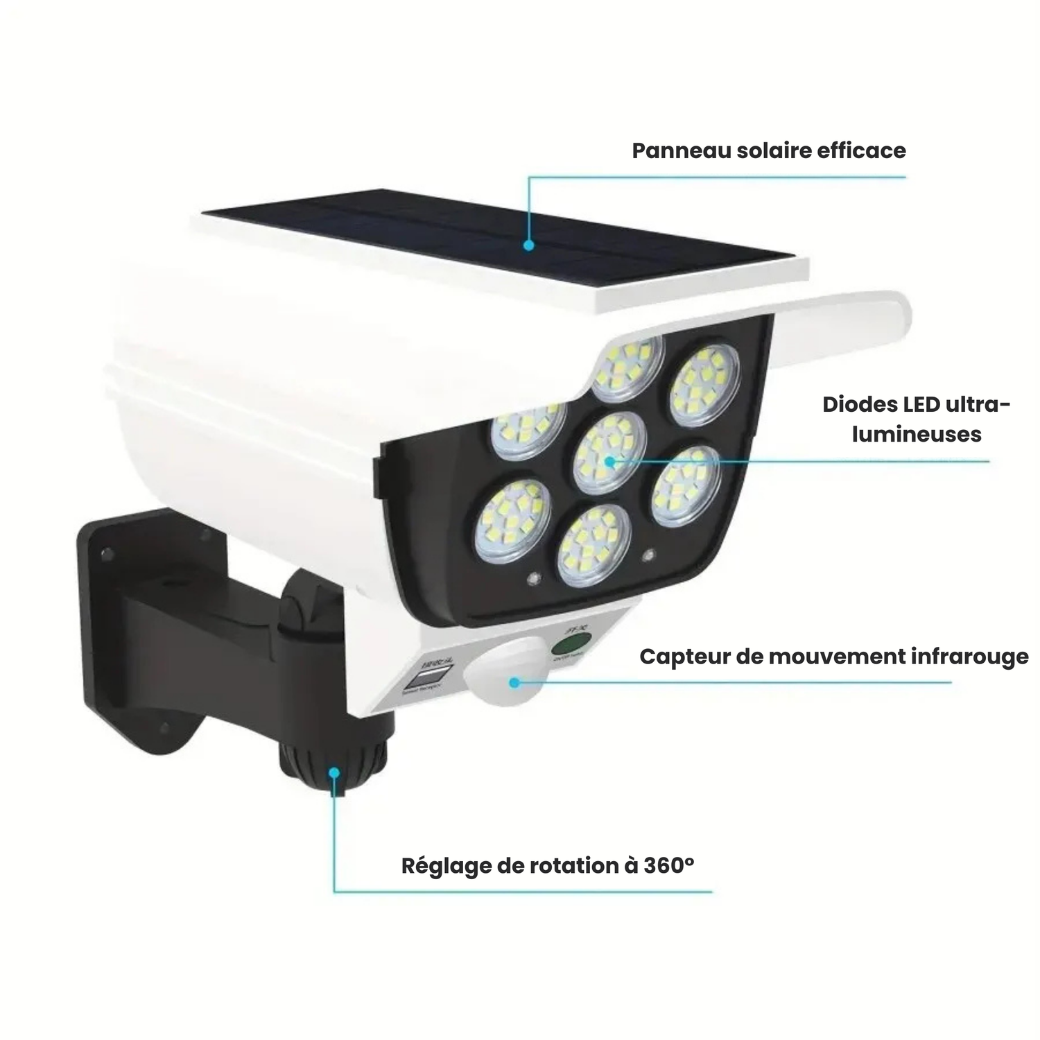 Ce projecteur solaire combine l’éclairage puissant des 77 LED avec une fausse caméra de sécurité, créant un dispositif de surveillance réaliste sans câblage ni frais supplémentaires. Il est résistant à l’eau (IP65), parfait pour les installations extérieures.